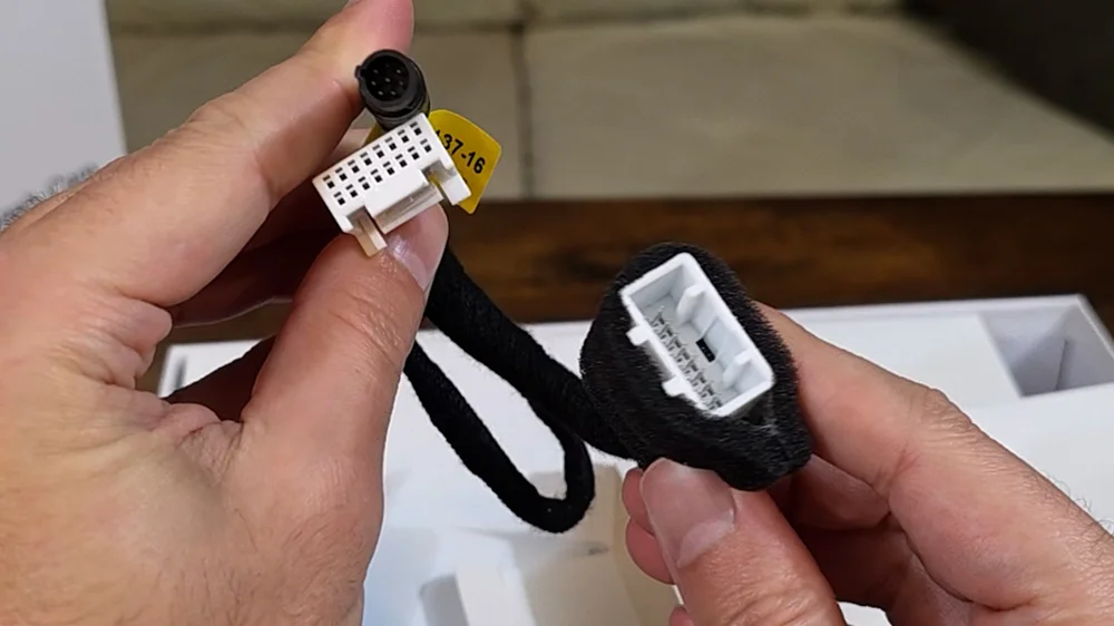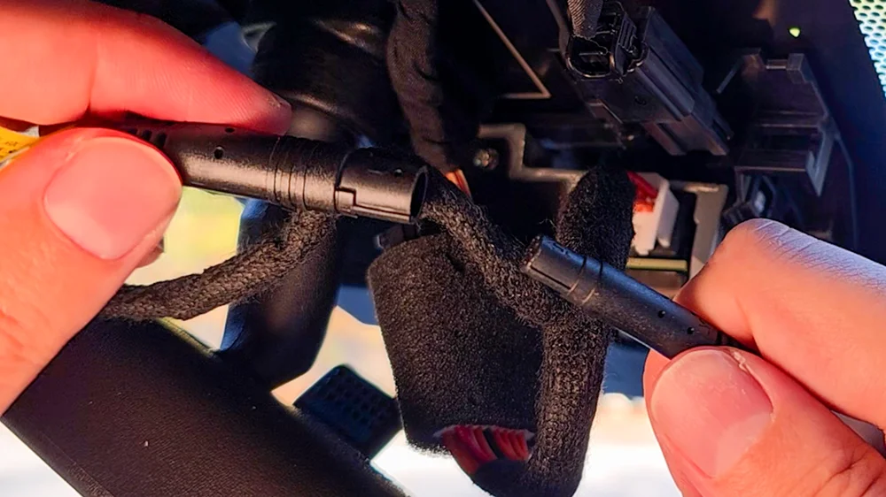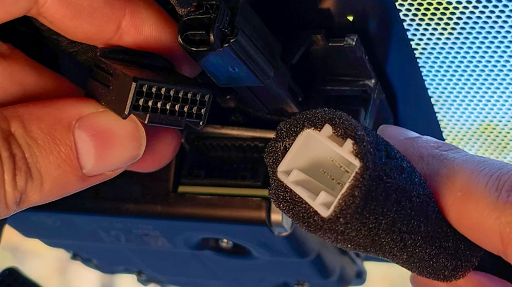 Back inside the car, unplug the factory power connector and attach the FitcamX power adapter and splitter.