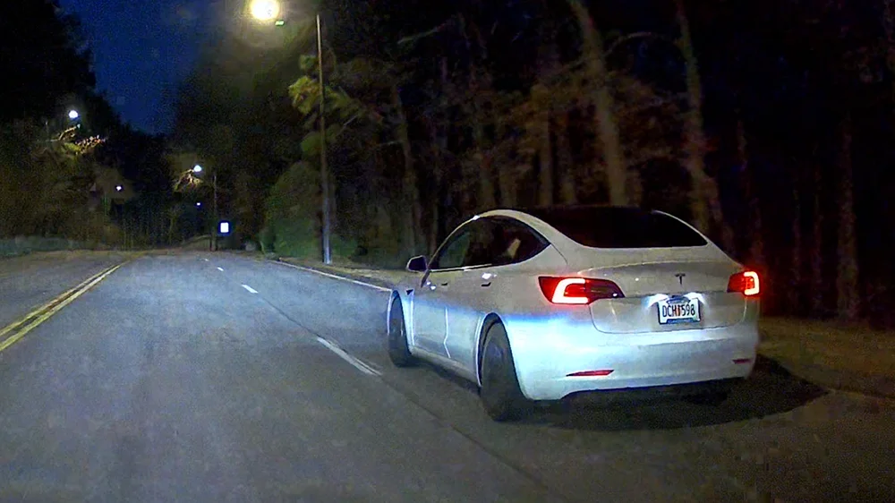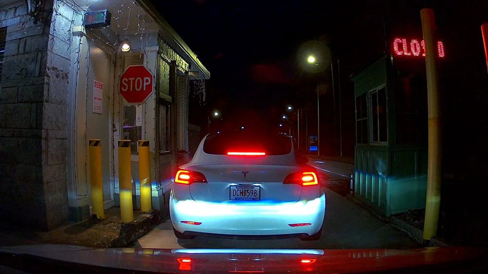 Depending on the lighting, you might get lucky and be able to read the Tesla’s plate even while driving slowly alongside it.